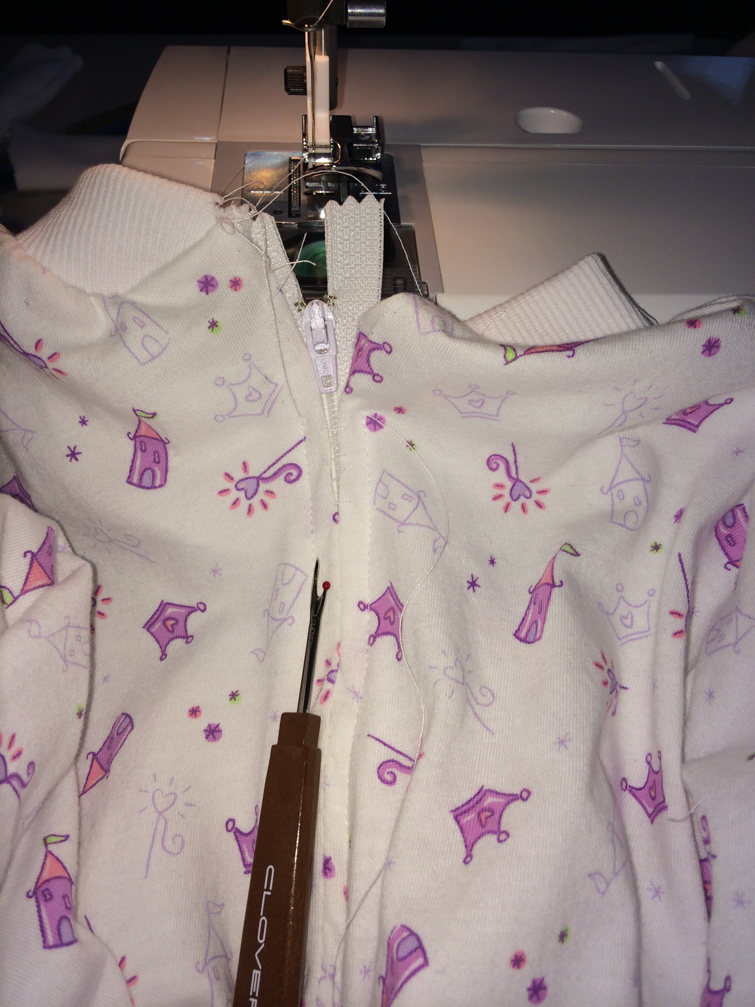 I do not have a serger at home, so this required me taking a special trip to my parent’s house in order to sew this up. I hadn’t bought a zipper yet, but I had most everything else so I figured I could do most of the work and install the zipper later. WRONG! Because I had to stitch on top of the zipper, keeping the front free, I was not able to stitch up the sides, which also delayed sleevework and making the casing.