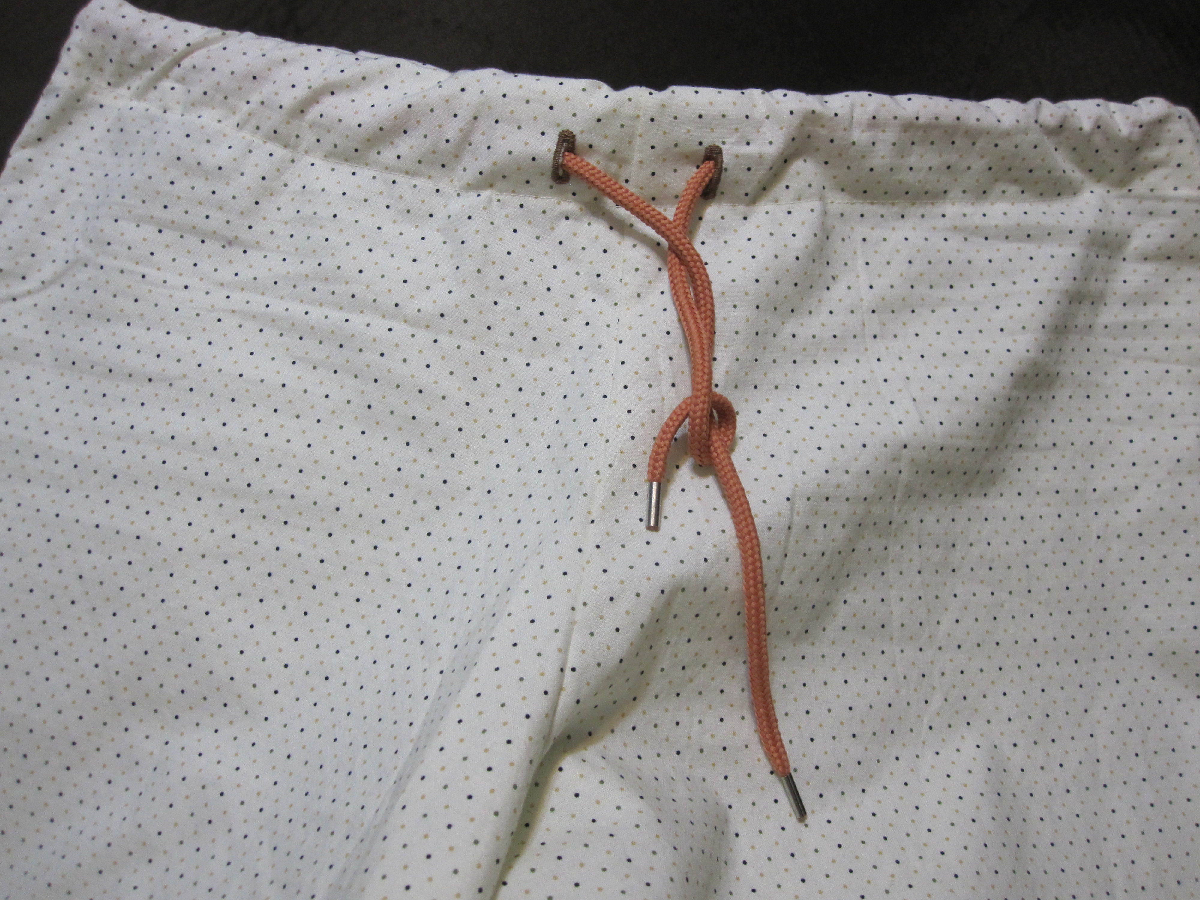 The only thing left is to make buttonholes for the drawstring, sew the waistband down and insert the elastic.