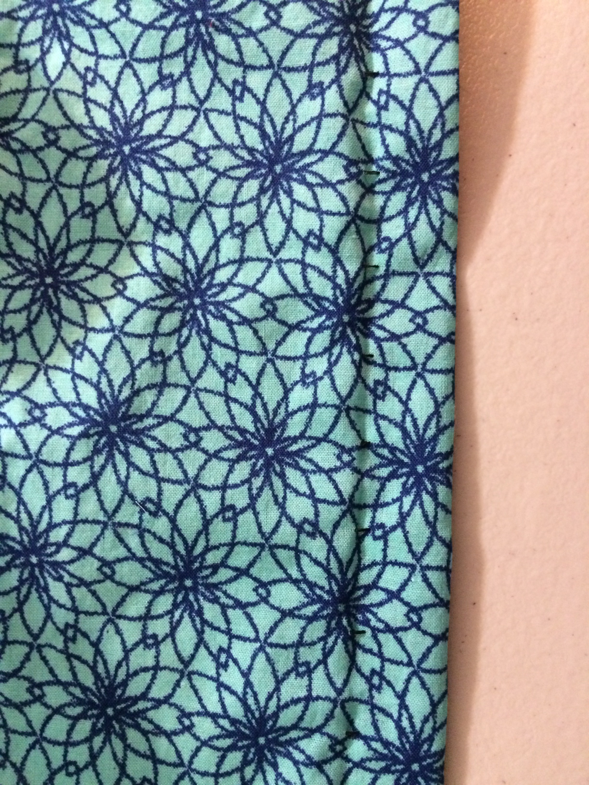 Yeah speaking of hand stitching – there was plenty to go around on this one with all the bias tape. I will say it did make finishing up the sleeves and neckline very easy. But I just never like the way my hand stitching comes out – I can’t get it looking neat and uniform. This pattern uses double-fold bias tape – there are many tutorials and the directions are pretty clear. It has you open the bias tape up and attach one side to the right side (this can be done on the machine thankfully), then when you fold it back around, you hand stitch the tape to the dress on the inside. Then….