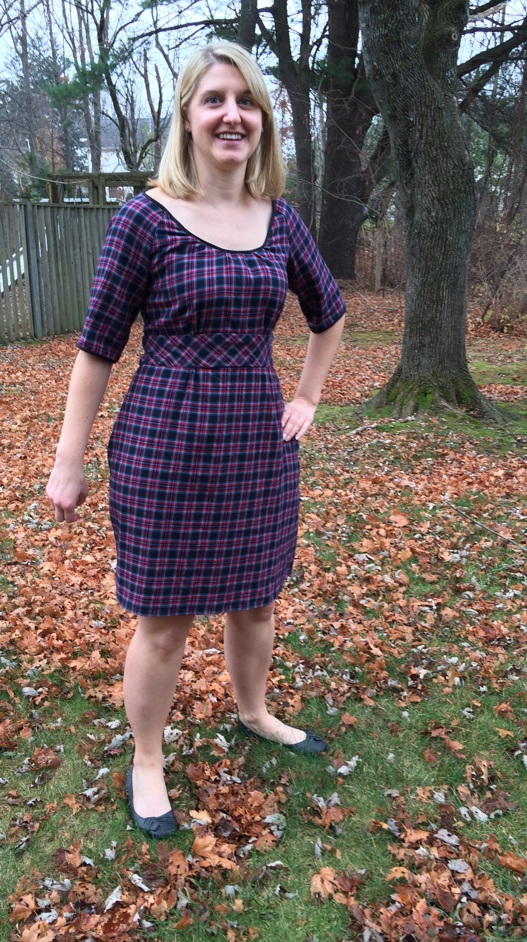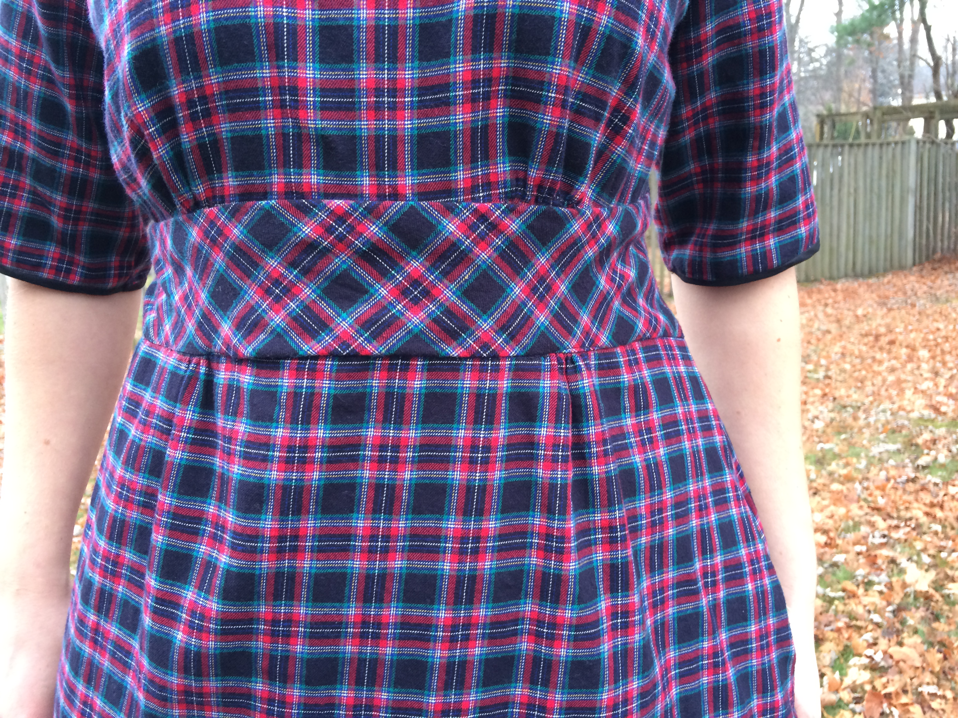 I bought this fairly light-weight tartan fabric when I was on vacation in Scotland last summer. I had a picture in my head of the type of dress I wanted to make from it – something simple but also stylish that would really show off the plaid design. The Dahlia dress seemed perfect – the shape was similar to some highland-style dresses I had seen online, the bias binding on the neck and sleeves gave it some ease and simplicity, and there was an plaid example on the website. Huzzah! The website also features some online tutorials that tell you exactly how to match the plaid – even on the sleeves. They were extremely precise and helpful. One thing I am starting to love about indie patterns.