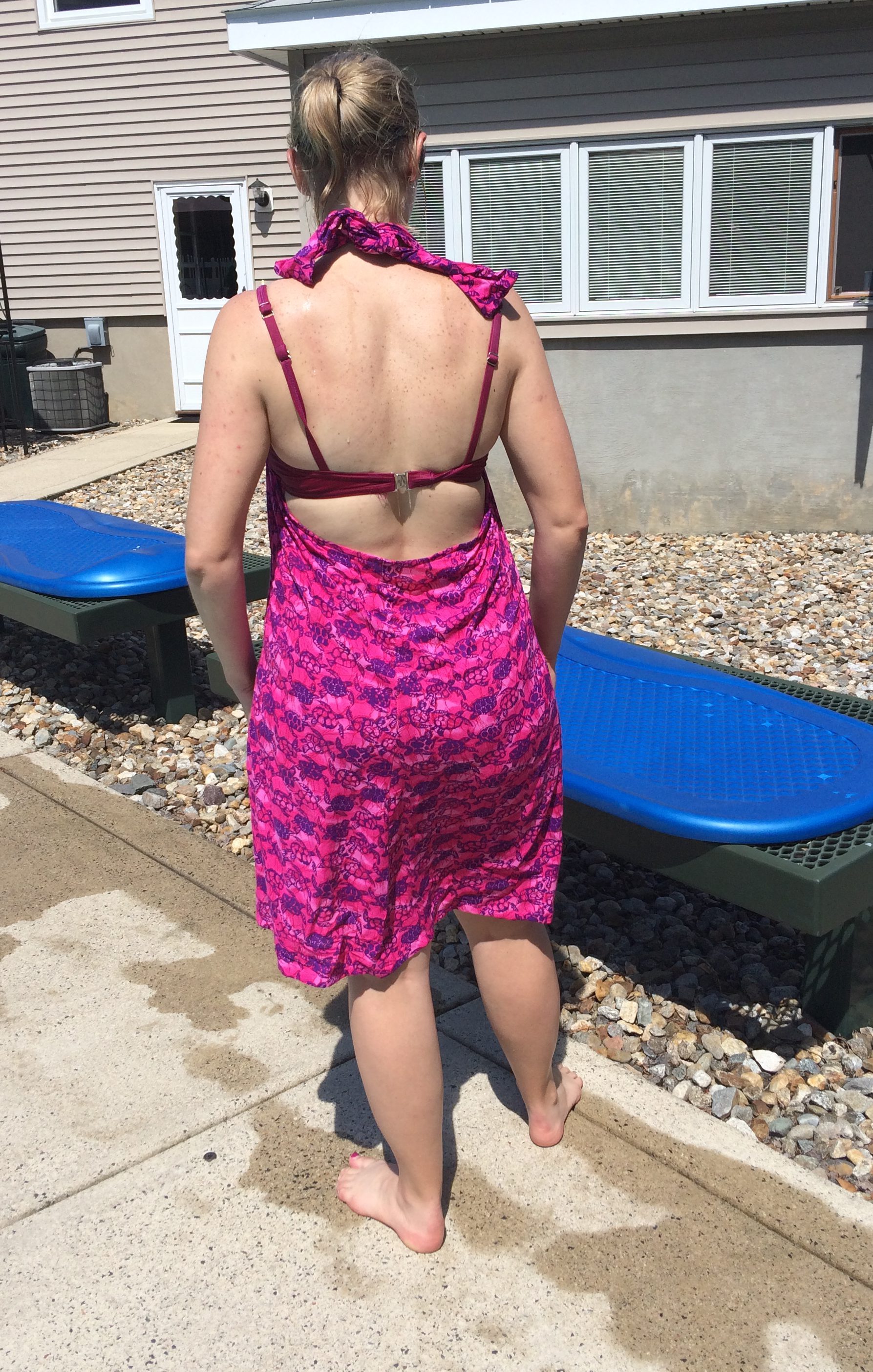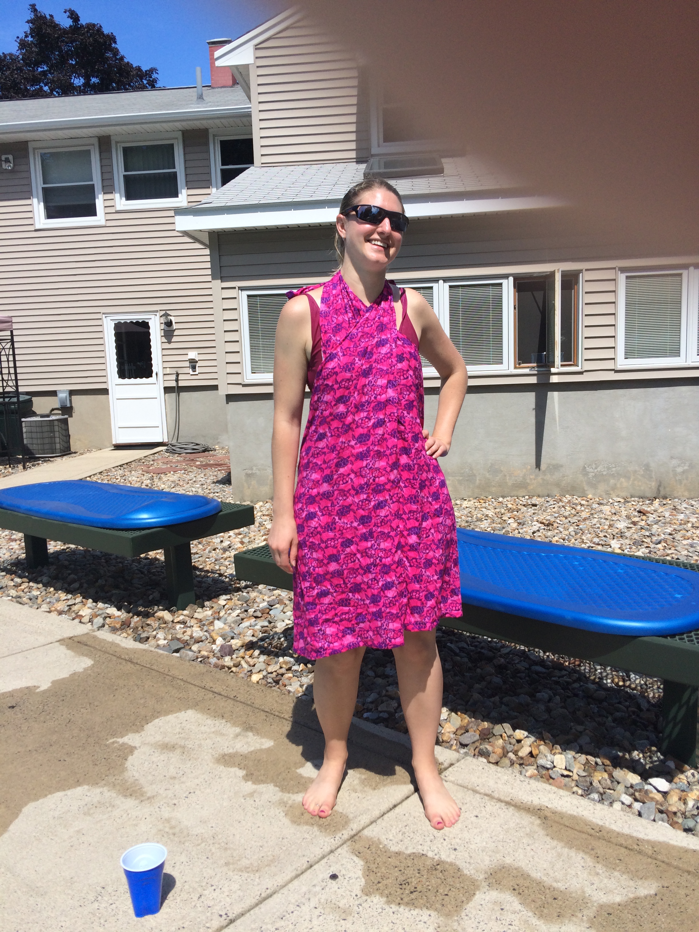 Some simple google searches did not help me, so I went onto a site I have been an inactive member on called http://sewing.patternreview.com/.  I was able to find and purchase the perfect pattern – it was a simple dress-like cover-up that is sewn in two pieces, with no buttons or notions.  You simply tie it around the neck, but it still has the shape of a dress so I don’t have to figure out some complicated folding structure when putting it on.