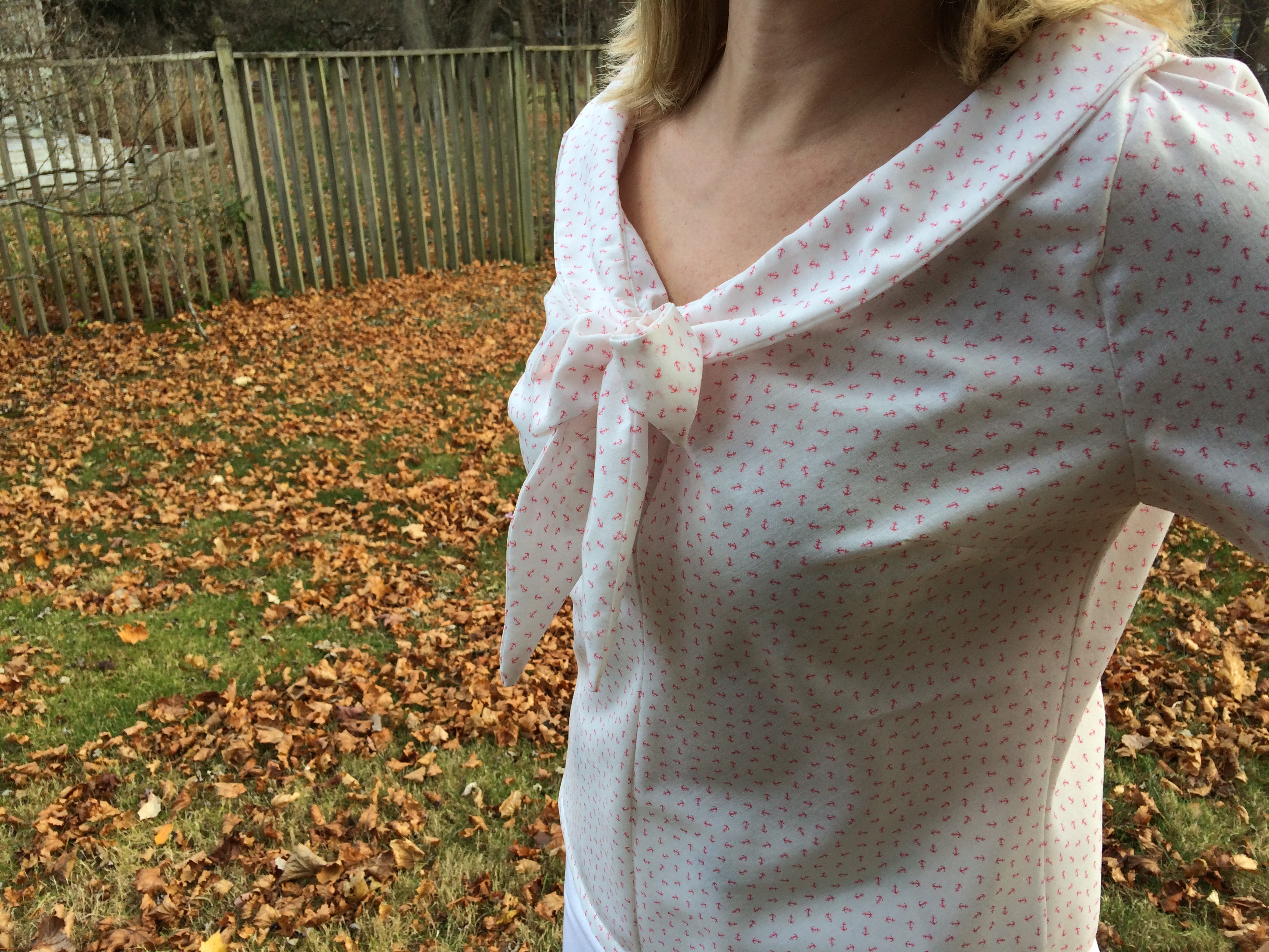 When I first started on this top, I had cut all the pieces for version 2. Since the fabric had anchors on it, I thought having a sailor look would be really cute. I even found some really nice navy blue fabric that I had leftover from another project that seemed to work perfectly for the collar. I liked the sleeves on this version better too. When I started to get ready to sew, I stared at the pieces for a long time. I couldn’t decide if I really liked the navy ties after all and worried it would end up being something I didn’t want to wear that often. I began to imagine it as a disaster, which may seem a bit much, but there is nothing more heartbreaking than making something you dislike with fabric you fell in love with. The more I looked at the two drawings on the cover, the more I thought the other bow was more versatile and would look nice under a nice cardigan for the winter months ahead. I decided to switch to the longer tie version, made with the same material instead of the contrast. Luckily most of the other pieces are the same and I had just enough anchor fabric left to cut this new bow out. I did, however, keep the sleeves from the original version. I still liked them better and now I had sort of a hybrid between the two versions, which is kind of cool.