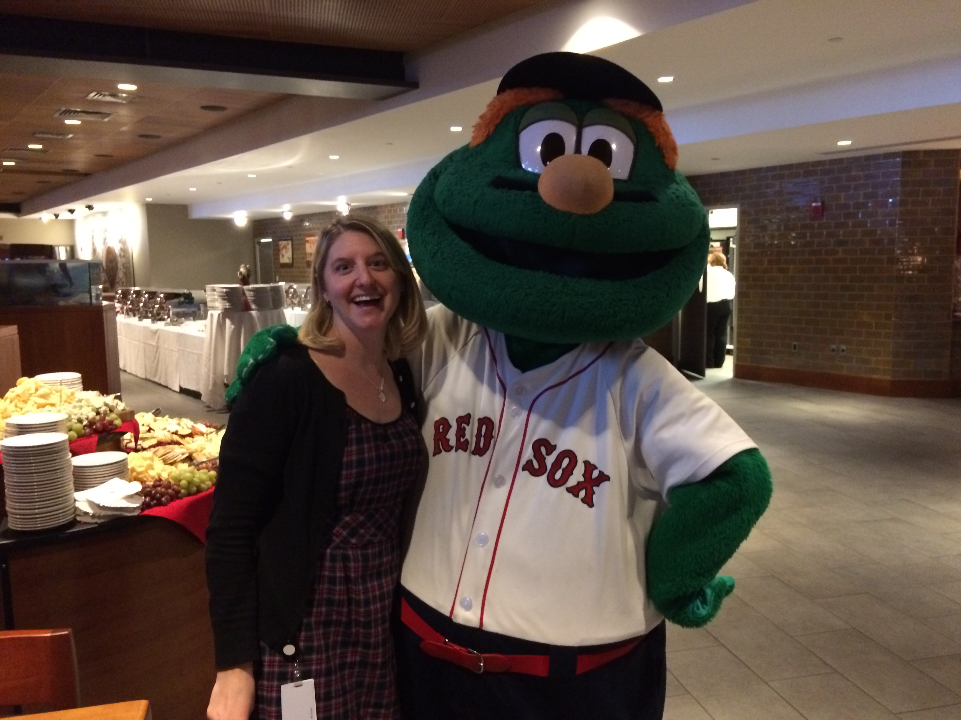 I really love it when me-made clothes have some extra fun. Here I am wearing my plaid Dahlia dress at my company Christmas party. It was at historic Fenway Park in Boston, so I got to meet Wally, the Red Sox mascot.