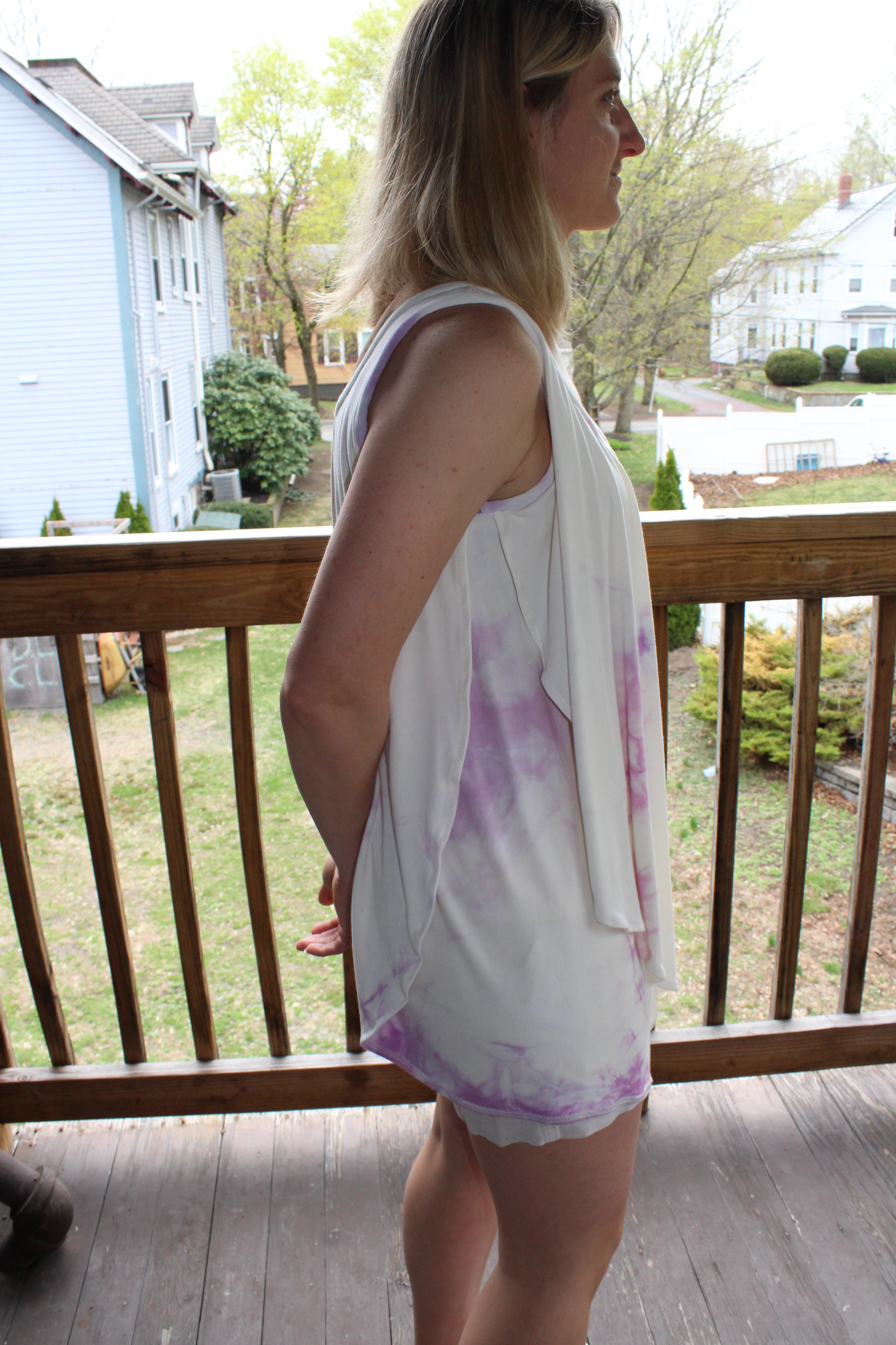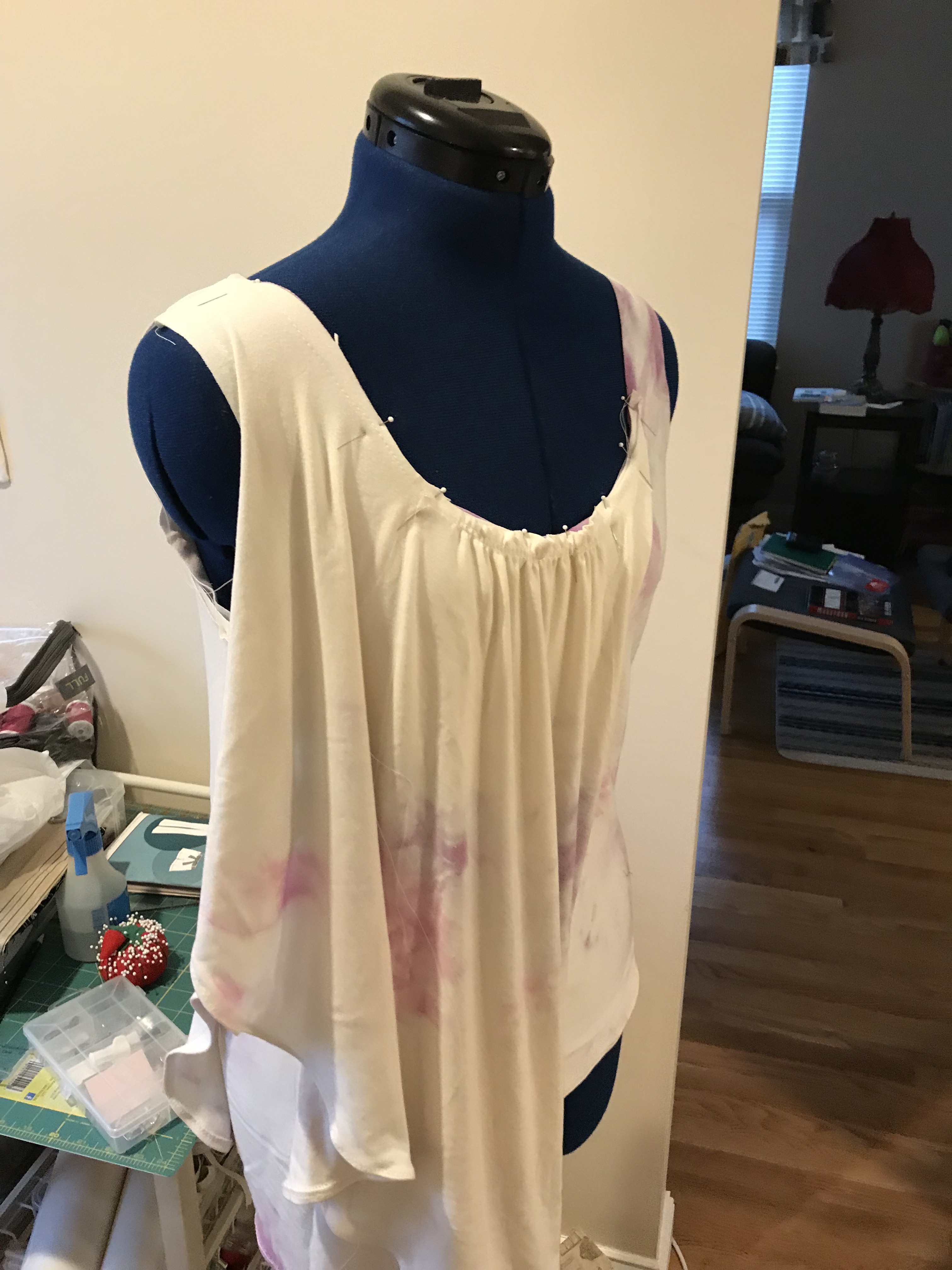 But first up, I do have a girl’s trip planned to Austin, TX in a few weeks. I’ve been trying to decide whether I want to bring this shirt I made recently. When I bought the fabric, which is a kind of tie-dyed knit, I envisioned it working with this pattern. I think visually the print works with this type of top. The main issue is that there is a lot of material, which makes this quite heavy with the weight of the fabric.