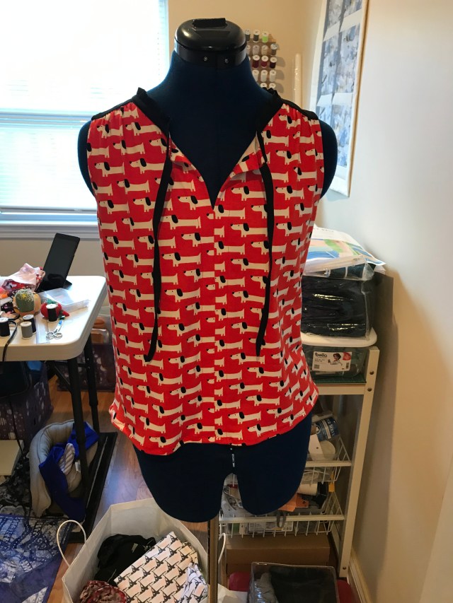 I’m extremely proud of this tank top, which uses the Vienna Tank pattern from Itch to Stitch. This pattern was intriguing to me because it uses both knit fabric and woven fabric and I had just the knit that I wanted to use. I found this great wiener dog fabric at Fabric Place Basement in Natick, MA and I thought it would make a cute animal-themed top. I found some soft black cotton for the yoke and ruffle to complete the garment.