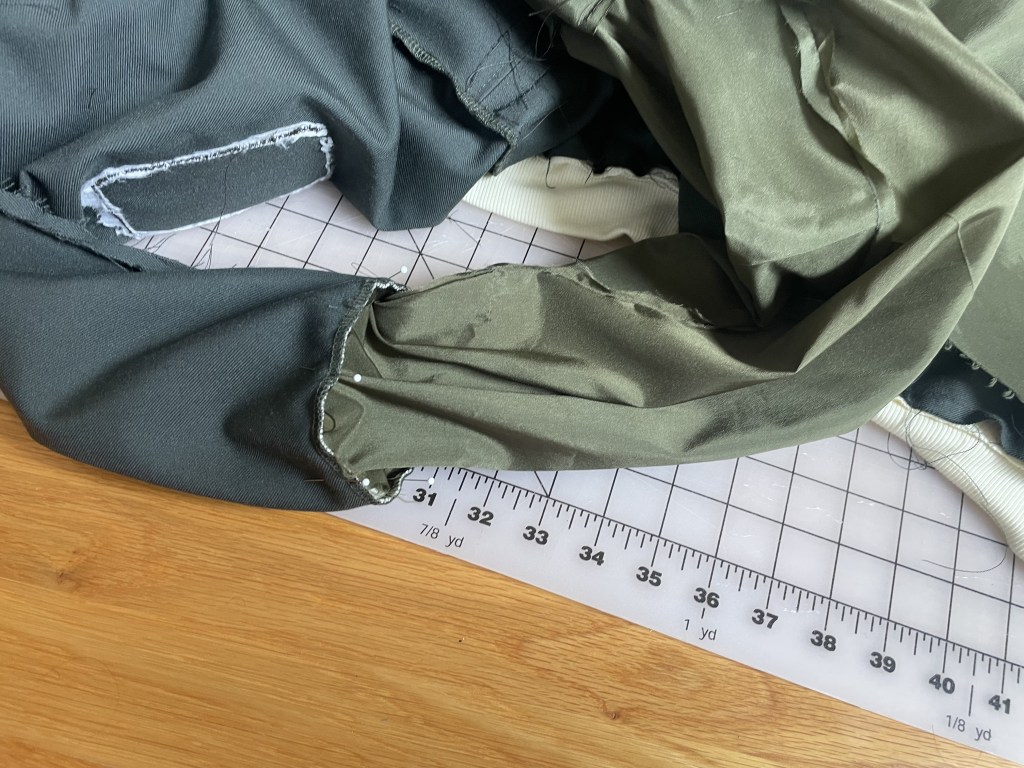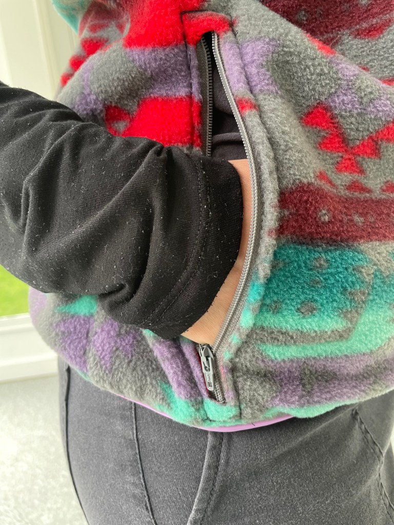 This vest did call for several types of fabric besides the fleece – there is a knit for the lining, woven fabric for the pocket flap and zipper stop and other fabric for binding the arm holes and bottom. Plus all the zippers. Getting all these things to match was a bit of a challenge, but after a few shopping trips and online orders, I got everything I needed to assemble it.