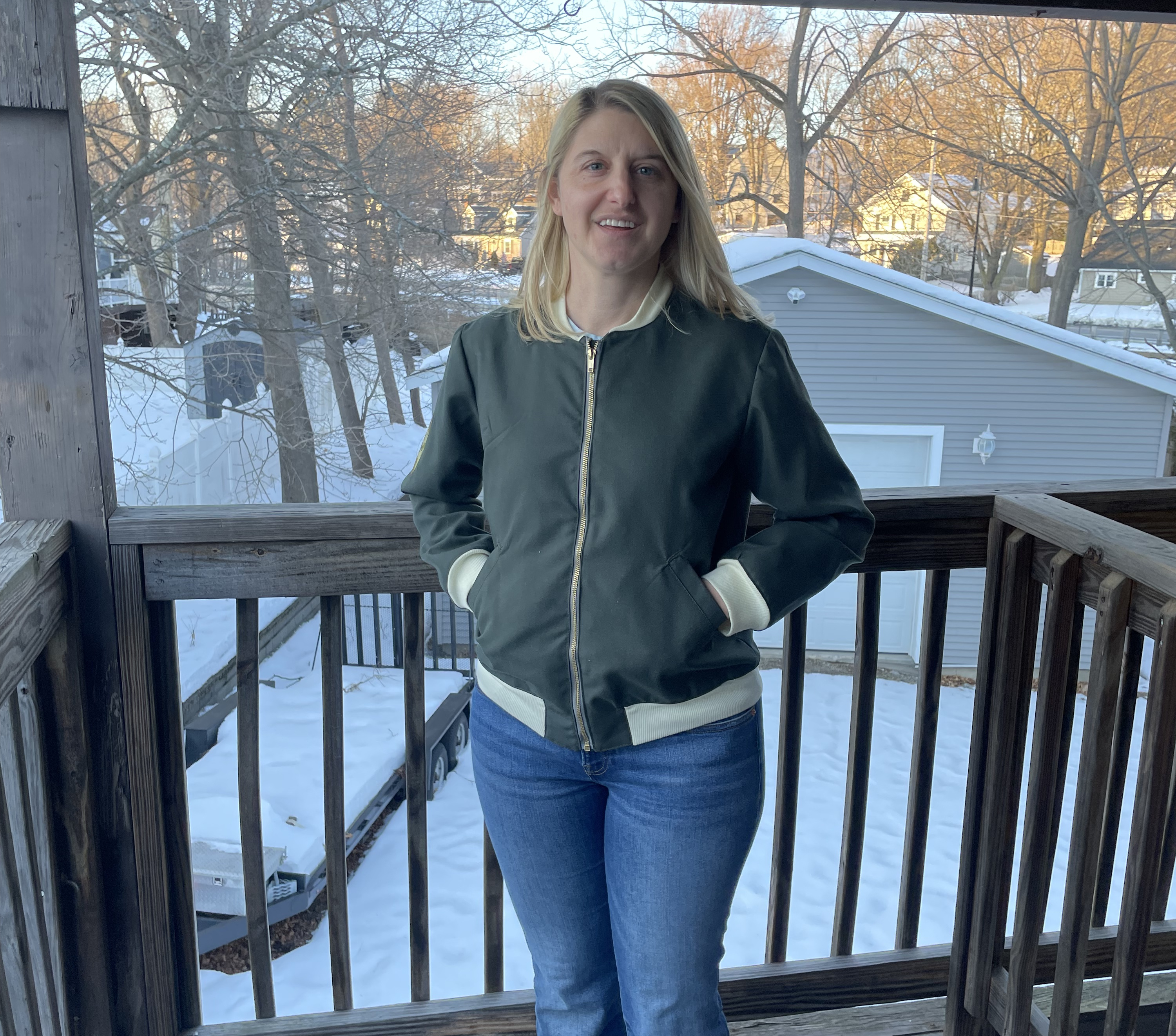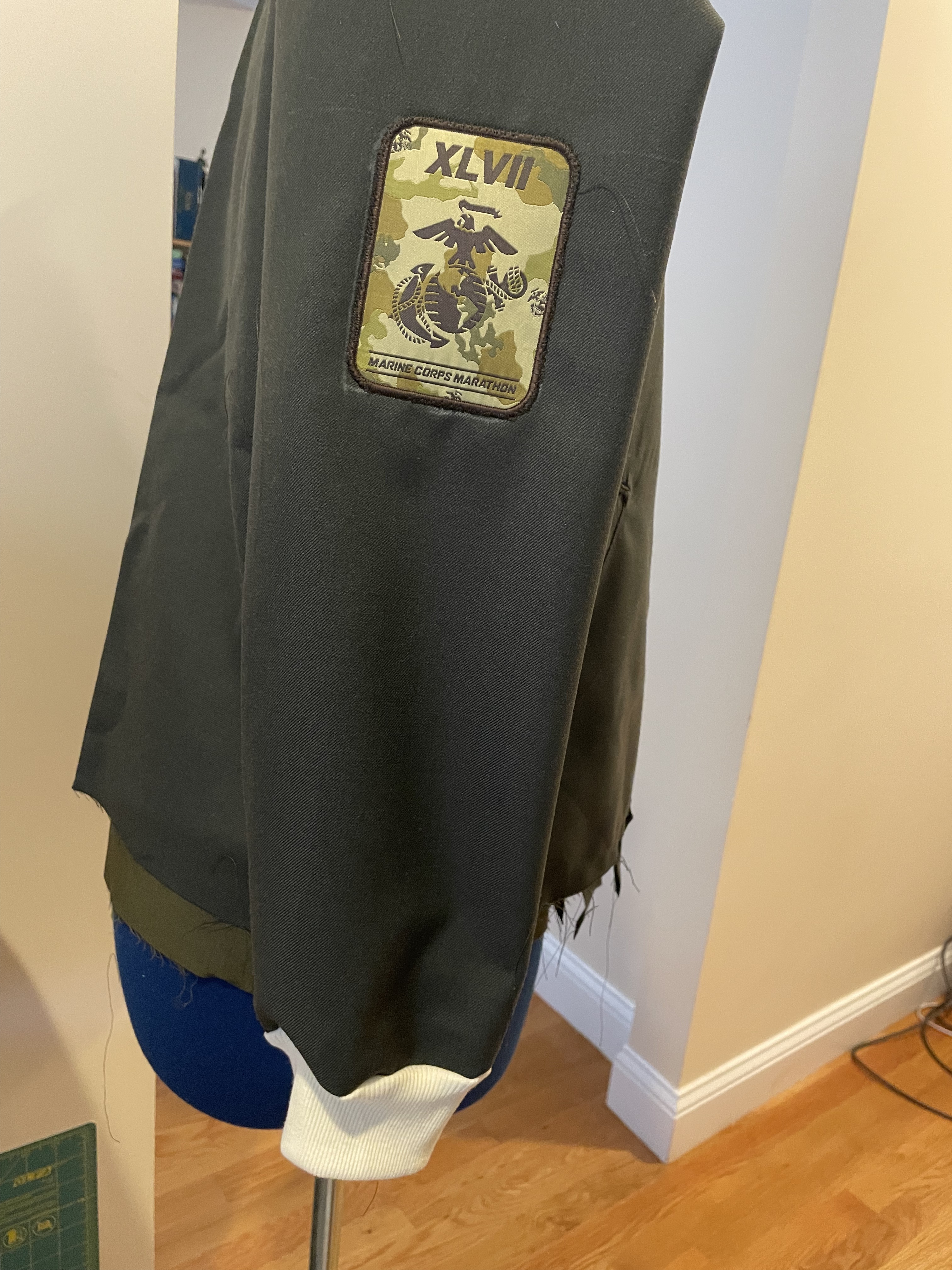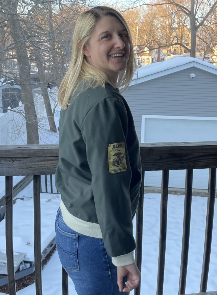One thing I had been trying to do more of in the last year, is make clothes in line with actual fashion trends. I saw that bomber jackets were making a comeback, so I decided to try my hand at it. Especially since I already had a pattern in my inventory, the Seamwork Larkin jacket. It was great because there is a helpful sewalong video on the website, which helped me navigate making my first ever coat. What makes this jacket special was that I was able to attach a patch I received after running the Marine Corp Marathon in 2022.